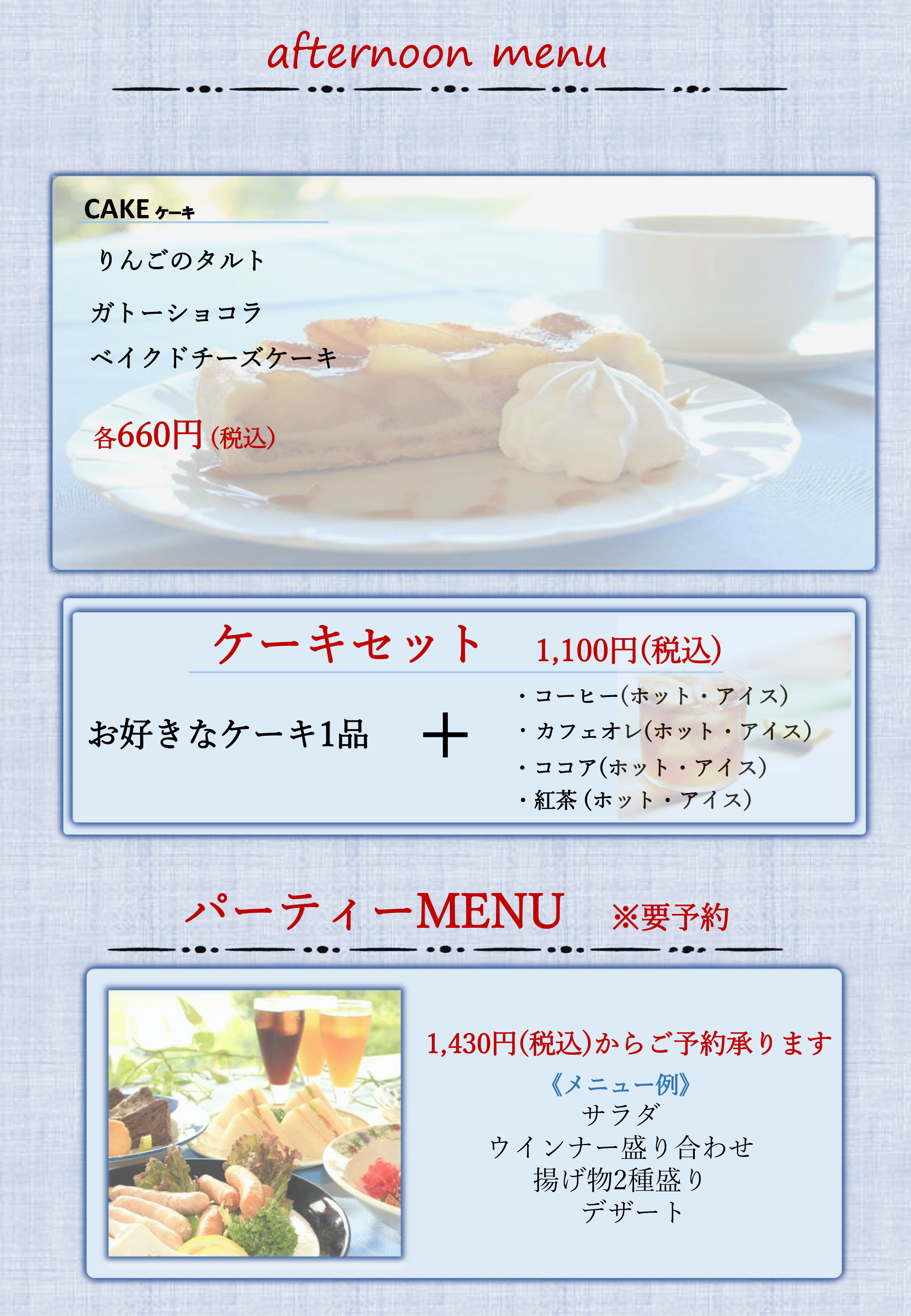 アフタヌーンメニュー・パーティープラン